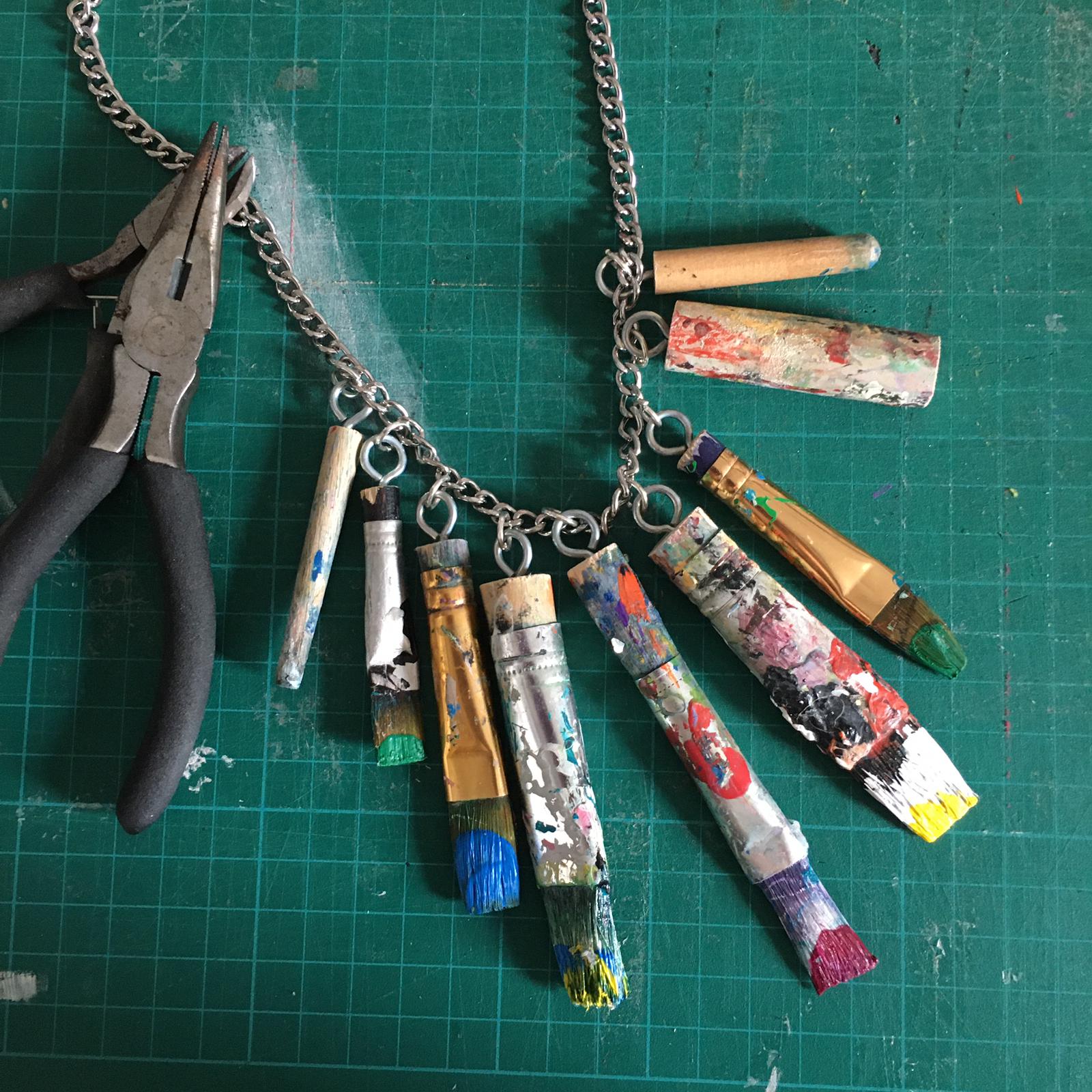 לאחרונה הצטברו לי המון מכחולים וממש "דגדג" לי באצבעות להשתמש בהם קצת אחרת. אז ניסרתי אותם לחלקים קטנים וחיברתי להם וו סגור בקצה.